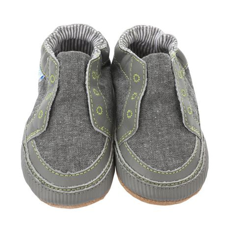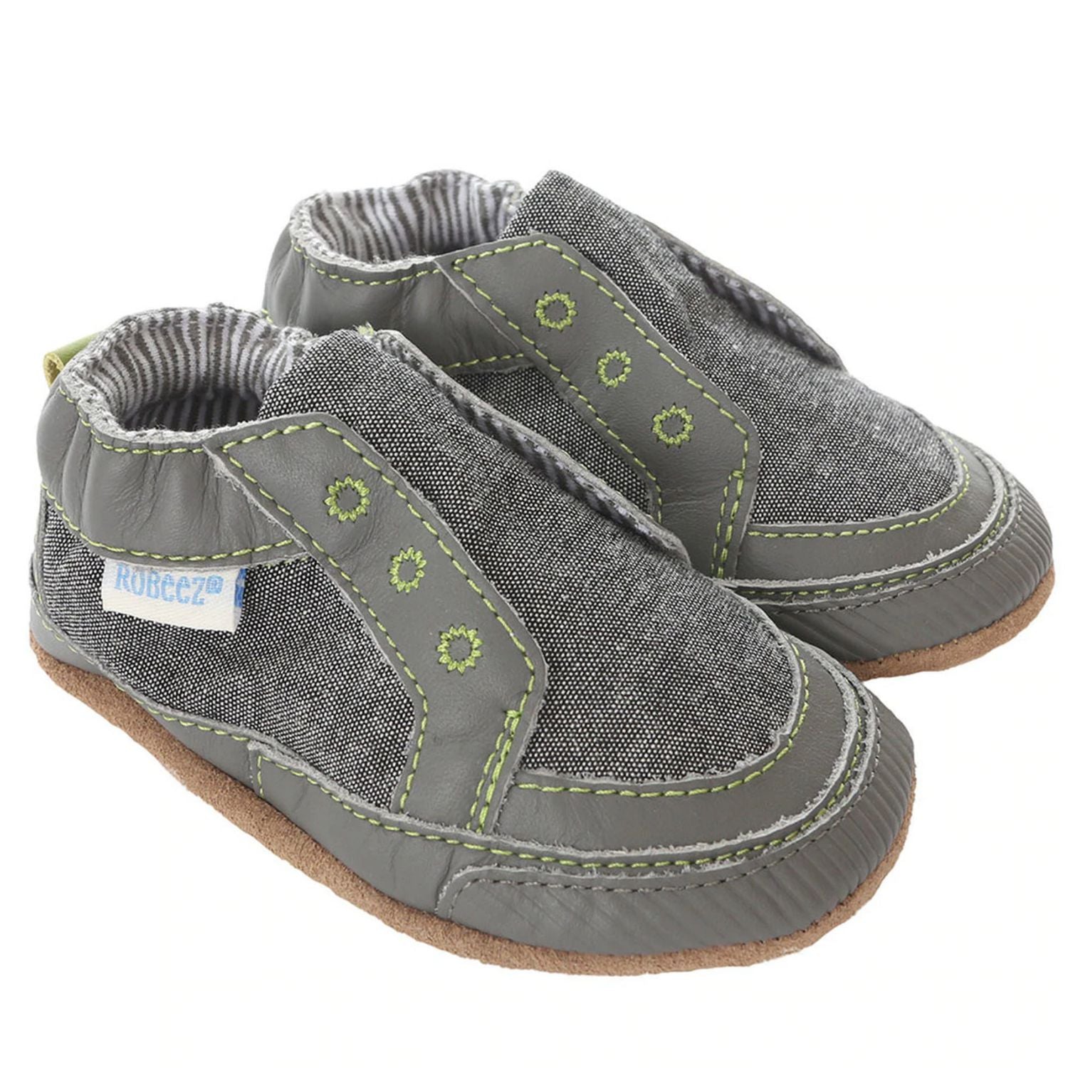 Inspirée des tendances de la chaussure pour homme, cette chaussure pour bébé à semelle souple ressemble à la sneaker décontractée de papa. En toile grise, cette chaussure pour bébé présente des coutures vert clair et des garnitures en cuir gris. La doublure en coton rayé blanc et gris complète le look mini-me de cette chaussure.