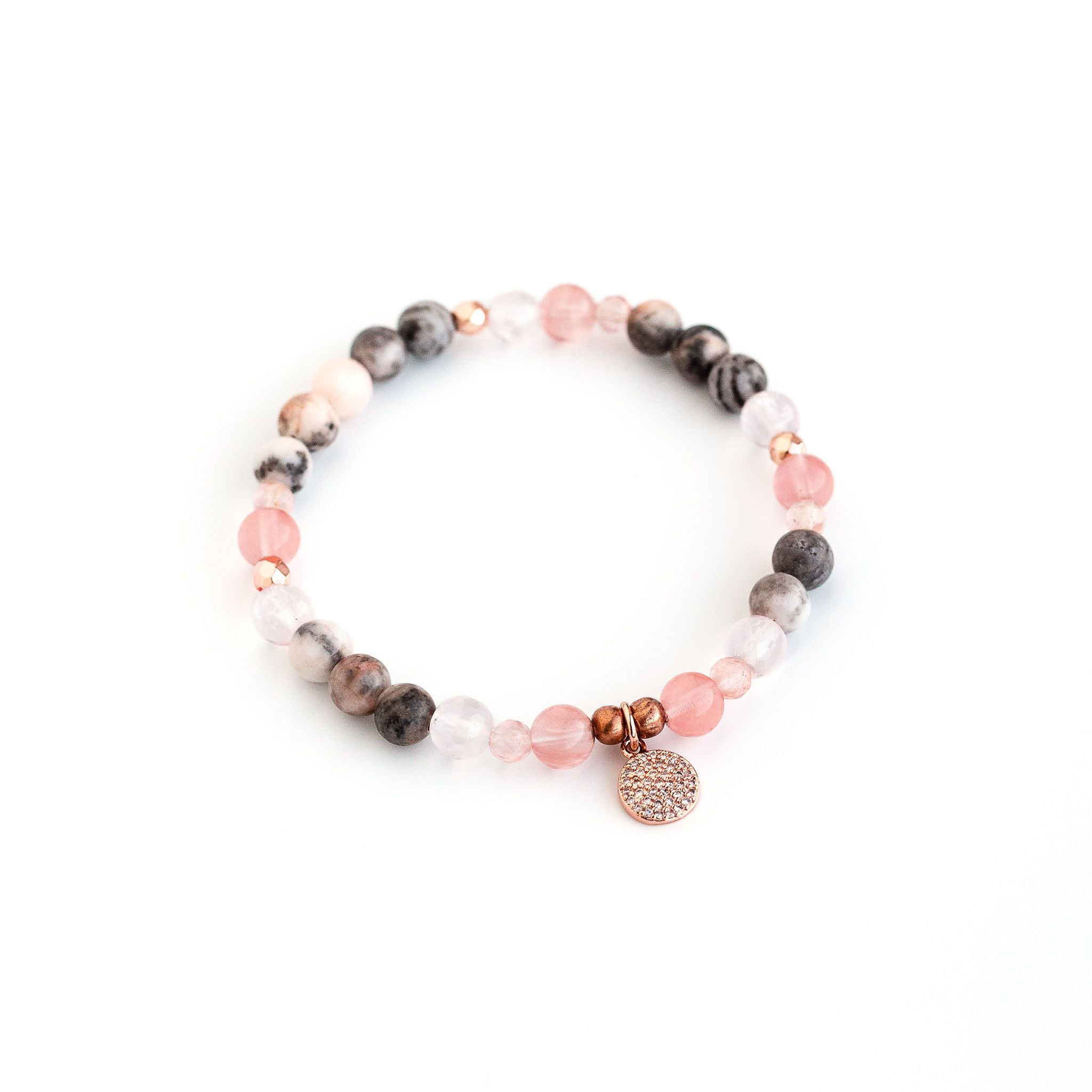 Magnifique bracelet aux pierres délicates 6 mm fait de jaspe gris tacheté rose, de petite pierres de quartz cerise rose et quartz rose. Le tout orné d'une breloque rosegold pavé de zircon.