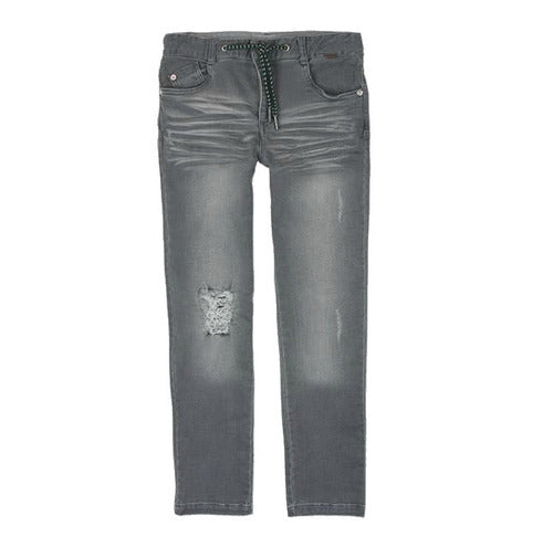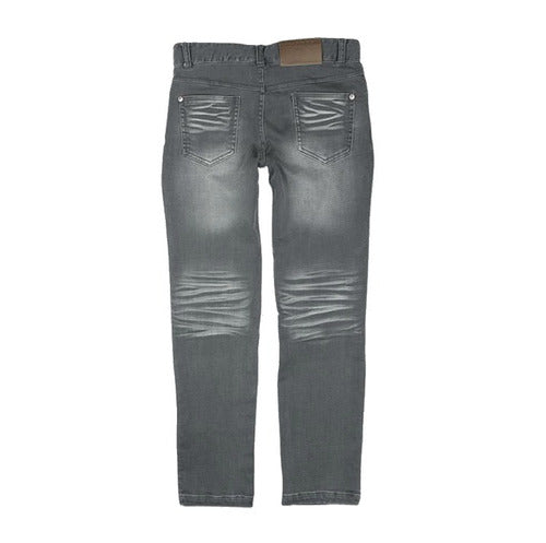 Pantalon de denim gris extensible et très souple, ce qui le rend très confortable à porter.