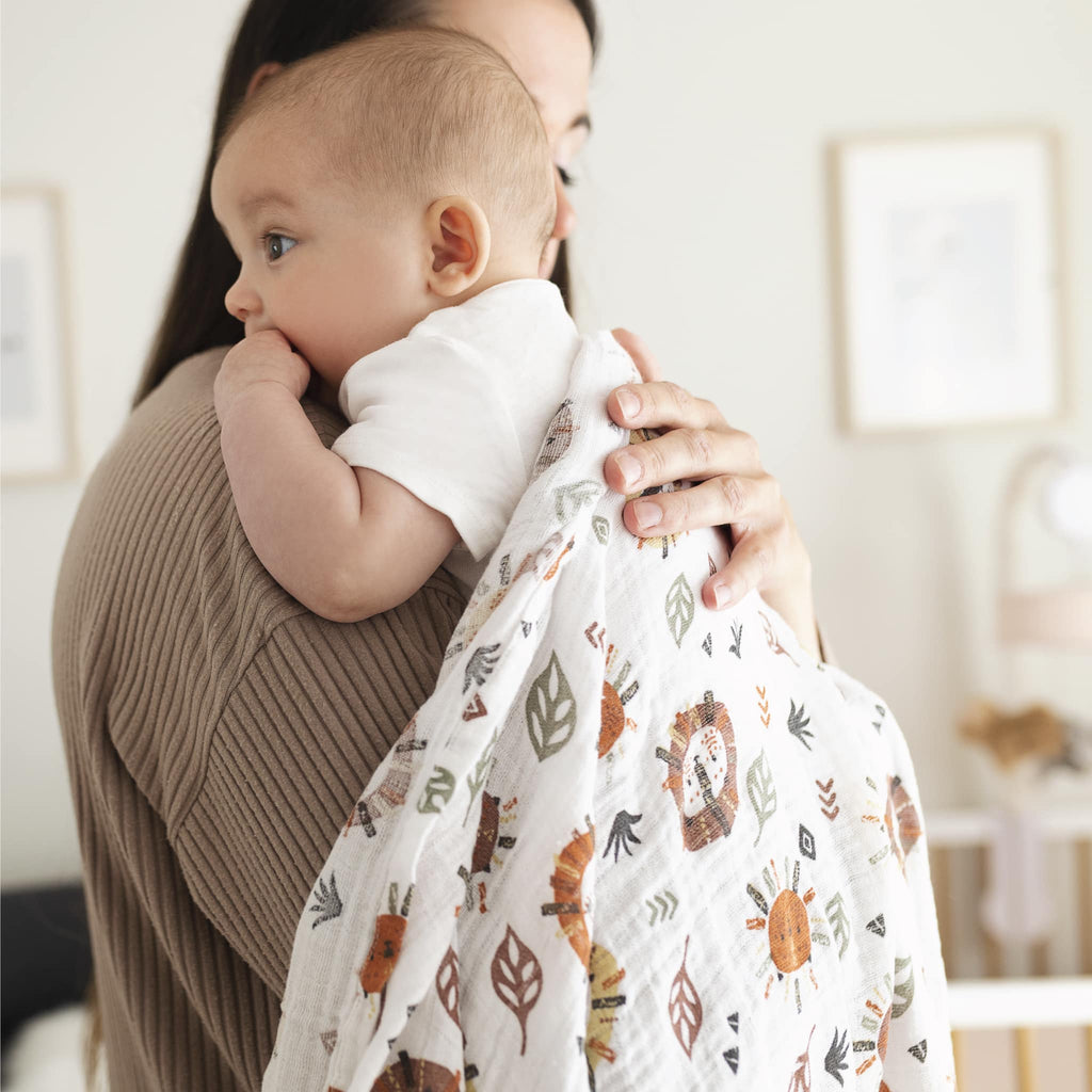 Couverture d'emmaillotage de mousseline 100% coton. Pré-lavée et ultra légère, cette couverture multi-usages en mousseline est de manière à permettre à l’air de circuler de façon optimale.