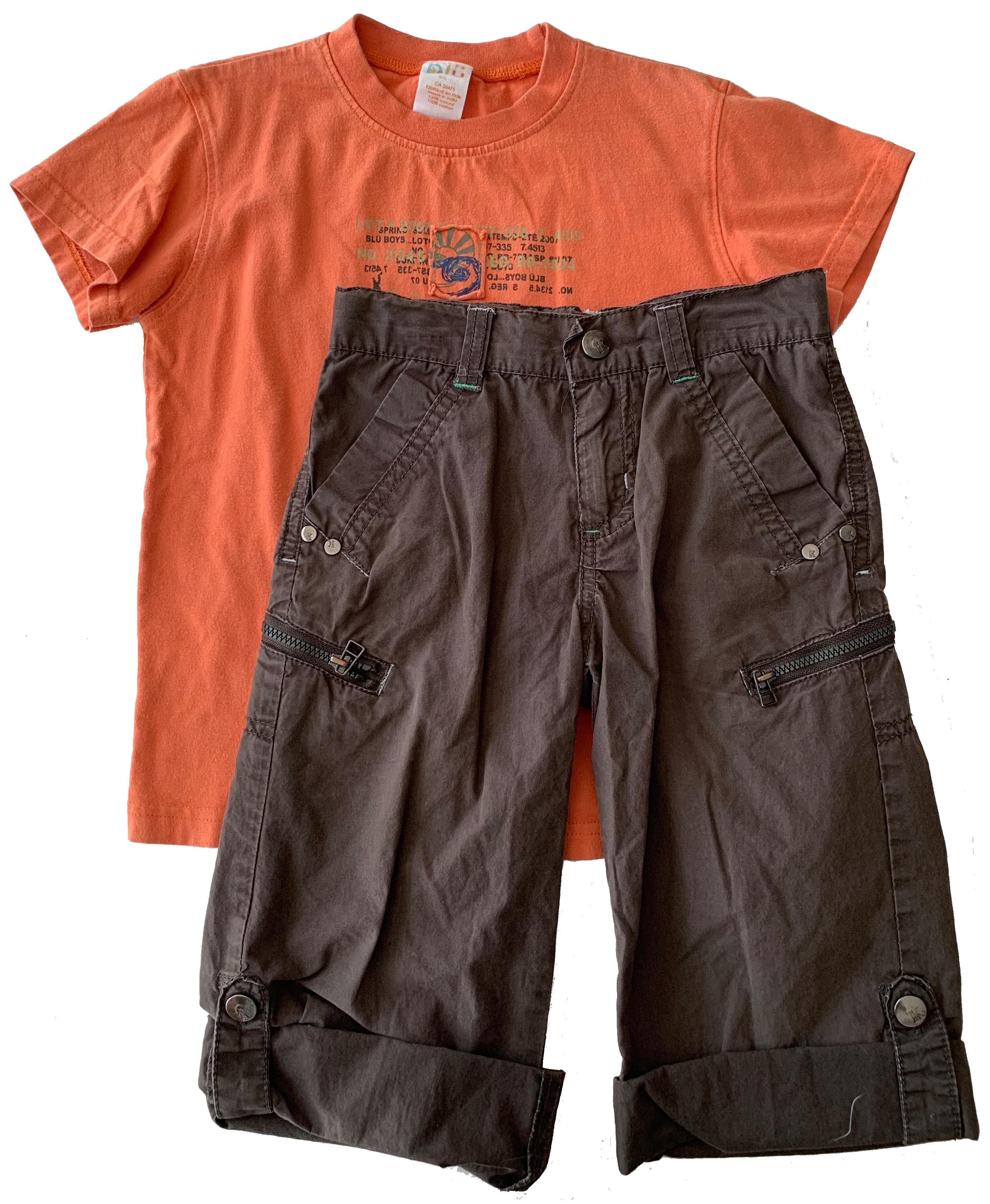 2mcx, Blü- chandail m/c coton orange motif feuillage devant + Kricket- bermuda coton brun