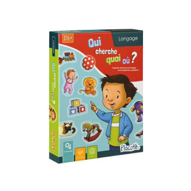 Qui cherche quoi où? est conçu pour aider les enfants de 1½ an à 3½ ans à développer leur compréhension de questions simples formulées avec les mots interrogatifs «où», «quoi» et «qui», et de la question «qu'est ce qu'il ou elle fait?». Le jeu présenté sous forme de «cherche et trouve» leur permet d'apprendre tout en s'amusant.